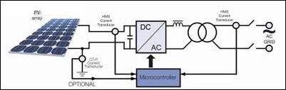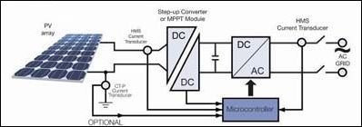 通常在剛好在PV 方陣后使用最大功率點(diǎn)跟蹤(MPPT)組件來(lái)確保方陣工作在其最大功率運(yùn)行水平。通過(guò)使用用于跟蹤功能的電流和電壓傳感器,應(yīng)用一種特殊軟件算法和專用電子元件一起來(lái)控制電池板(電池)的工作點(diǎn)。一般來(lái)說(shuō),一臺(tái)電流傳感器可用于測(cè)量單相輸出(供到電網(wǎng)的電流),而另一臺(tái)傳感器可用于測(cè)量輸入直流電流(10-25A)。在三相輸出的情況下,兩臺(tái)傳感器可用于測(cè)量三相輸出的交流電流。接入電網(wǎng)的DC/AC逆變器是一臺(tái)將直流信號(hào)轉(zhuǎn)換為正弦波的全橋逆變器。