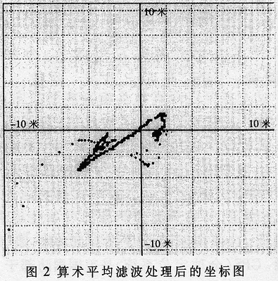 圖2、圖3、圖4分別是對利用Visual Basic6.0開發的數據采集與處理程序采集的10小時GPS數據進行幾種數據處理后的坐標示意圖(其中,橫坐標、縱坐標分別表示經、緯度)。從這三個圖中可以看出,從圖2到圖4,數據收斂性依次增強,可見綜合幾種濾波法于數據處理中,將大大減少誤差,提高系統精度。