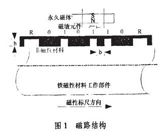 采用圖1所示的測量結構,其中被測工作部件要求屬于鐵磁性材料。文獻中指出在固定的磁場中,表面變化的曲率越大,引起的周圍磁場,變化也越大。為了使磁場的影響最大,選用凹槽作為測罩標志,以單位寬度(bmm)的凹槽表示“0”或碼元間隔,單能寬度的“凸槽”表示“1”,兩倍單位寬度的“凸槽”表示標志位R。在工作部件表面,按上述的編碼規則加下出一系列凹槽,然后噴涂上非磁性材料,形成磁性標尺。圖1所示的磁性標尺表示Gray碼01 1010碼區,黑色部分表示非磁性材料。