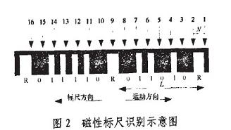 根據磁敏傳感原理,“凹槽”和“凸槽“會導致不同的磁場強度,從而使磁敏元件相應地輸出不同的電半信號“0”或“1”,形成數值碼,用于確定位移的粗讀值;而標志位R碼寬兩倍于碼元“1”寬度的特點,使得識別后的序列出現具有固定特征的標識碼,它用于精讀數。