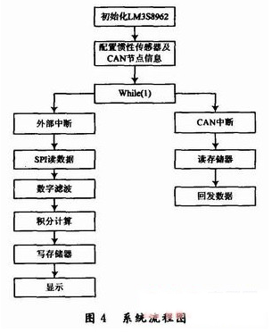 傳統研究方法是先建立數學模型,后期采用數據處理算法來糾正誤差。在慣性系統的應用中,這不僅要求數學模型準確可靠,而且普通的微控制器由于處理速度限制,而很難處理如此大的數據量,采用高性能DSP無疑增加了成本。為此,設計了以LM3S8962為核心處理器,以ADIS16365為慣性傳感器的慣性系統。該系統利用ADIS16365自身的數據處理功能對三軸角速度和角加速度數據進行處理。在外部再經過濾波與積分,得到了精確的角度信號,滿足了系統的可靠性和。控制要求。此外,面對系統對慣性數據需求量的增多,將該慣性系統設計為一個CAN節點應用于整個系統。