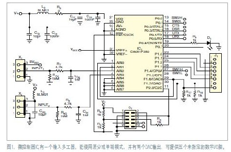 本設(shè)計(jì)中的電路包括一個(gè)混合信號(hào)微控制器、一只USBUART(通用異步接收器/發(fā)射器),還有一個(gè)新穎的自適應(yīng)模擬傳感器輸入電路。此電路可以將多種類型的傳感器接到設(shè)計(jì)的兩個(gè)模擬輸入通道上,在一個(gè)USB主機(jī)上控制這些設(shè)備,讀出測(cè)量數(shù)據(jù)。USB連接為電路提供電源。在計(jì)算機(jī)上就能用簡(jiǎn)單指令控制設(shè)備;甚至用終端軟件也可以做測(cè)量工作。8051核有免費(fèi)的工具, 便于做編程工作, 如IDE(集成開發(fā)環(huán)境)、調(diào)試器以及C編譯器。