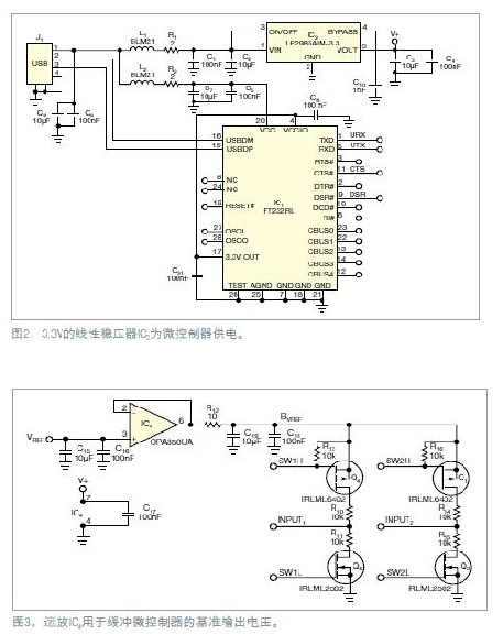 3.3V的線性穩(wěn)壓器IC2為微控制器供電(圖2)。從USB端口通過(guò)磁珠與濾波器,就可以直接為USB芯片IC1供電。這款芯片是常見(jiàn)而可靠的USBUART芯片,可與使用任何操作系統(tǒng)的計(jì)算機(jī)通信。運(yùn)放IC4用作微控制器基準(zhǔn)輸出的緩沖(圖3)。
