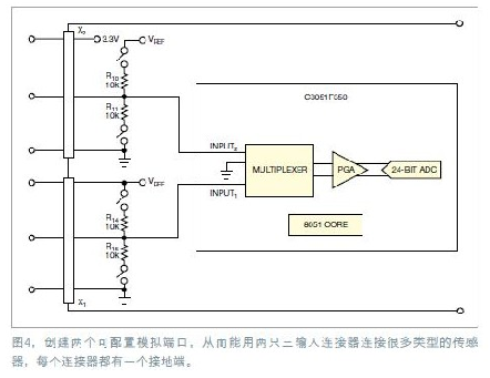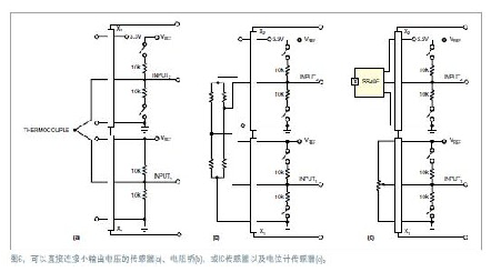 高分辨率ADC與PGA可以直接連接熱電偶(圖6)。通過(guò)切換一個(gè)通道上的上拉電阻和下拉電阻,就可以實(shí)現(xiàn)所需的偏置點(diǎn)。關(guān)掉所有內(nèi)置電阻,就可以采用直接連接的橋式傳感器(如測(cè)壓元件和壓力傳感器)。這些情況下,應(yīng)使ADC工作在差分模式。讓所有開關(guān)開路亦適合于采用電位器輸入或IC 傳感器的場(chǎng)合,如SS49E霍爾效應(yīng)磁場(chǎng)傳感器。