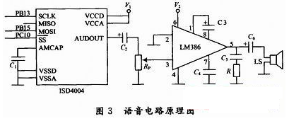 語音電路原理圖如圖3所示,由美國ISD公司的語音芯片ISD4004-16和美國國家半導體公司的音頻功率放大器LM386等元件構成。ISD4004 -16錄放時間為16 min(可分段),它采用CMOS技術,單電源3 V工作,內含振蕩器、抗混疊濾波器、平滑濾波器、音頻放大器、自動靜噪及高密度多電平閃爍存貯陳列。它內置微控制器SPI總線串行通信接口??蓪⒛M語音數據直接寫入單個存儲單元,不需通過A/D或D/A轉換。使得ISD語音電路具有音質自然、使用方便、單片存儲、反復錄放、低功耗、抗斷電等許多優點。LM386工作電壓范圍寬,電壓增益可調。具有自身功耗低、電壓增益可調整電源電壓范圍大、外接元件少和總諧波失真小等特點。本設計中STM32F103VC通過SPI2給ISD4004傳送語音信息。圖3中的V1和V2分別經三極管與+3.3 V和+12 V電源相連,三極管的通斷由STM32F103VC的PCI1和PCI2控制,只有在需要語音提示時,才使三極管導通給ISD4004和LM386供電。
