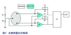 圖5所示為一個完整方案的框圖,該系統是由電池供電并可使用LM2623來提供3.3V的電源電壓。通過電極量度出來的電流之后會經由一個運算放大器被轉換成一個電壓,這個電壓再被送到微控制器處理,最后顯示在LCD熒幕上。