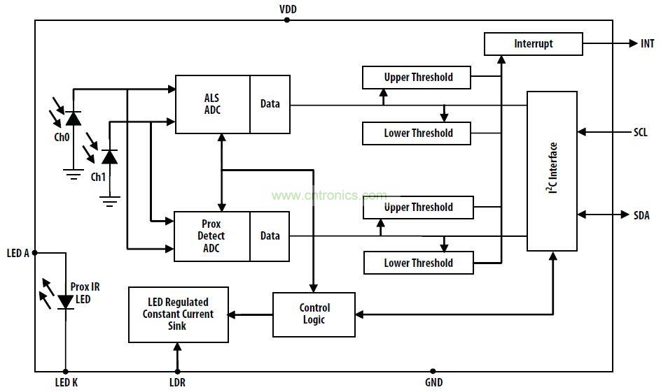 APDS-9901 在單個 8 引腳封裝內提供數字環境亮度和近接式傳感器 (ALS)、紅外 LED 和完整的近接式檢測系統。近接功能可進行 100 毫米即插即用檢測(無需擋風玻璃)因此減少了終端設備或子裝配的工廠校準需要。從明亮的陽光照射到黑暗的房間,近接檢測功能都能運作良好。寬動態范圍也允許,如手機的暗色玻璃后進行短距離檢測操作。此外,內部狀態機具有能將設備放置于 ALS 和近接測量之間的低功率模式的能力,提供極低的平均功耗。ALS 能在極低的光線條件或深色的面板后對亮度做出適光反應。