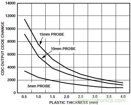 圖2所示為從CDC測量到的輸出數據。該數據表明,傳感器響應隨塑料厚度的增加而減少。CDC輸出降至500個碼以下時,按鈕傳感器的響應會不夠。此時很難區分真正的傳感器激勵和CDC代碼中的噪聲。10 mm按鈕可配合上方大至4 mm的塑料使用。傳感器越小,響應越小。對5 mm的按鈕而言,傳感器響應可降至約500個碼。對5 mm按鈕而言,建議采用2 mm或以下的覆蓋塑料來確保傳感器正常工作。