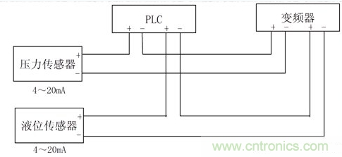 對于傳感器輸出的電流信號,只經PLC和變頻器的輸入阻抗之和不大于傳感器的輸出負載阻抗即可,壓力傳感器的信號可以同時串入PLC和變頻器,如只有壓力傳感器信號,則PLC和變頻器也都可以正常接收壓力傳感器的信號。而當液位傳感器的信號也同時接入PLC和變頻器時,因PLC接收信號的-端都在變頻器的+端,當兩傳感器的信號電流不一樣時,就有可能使PLC兩-端的電位有較大的差異,就就形成了共模干擾電壓。如PLC輸入端又互相不是隔離的,則會造成PLC的模擬信號輸入端接收不正常。變頻器的兩輸入信號是在PLC的后面,其-端電位可保持在變頻器內部電路設定的狀態,問題不大。