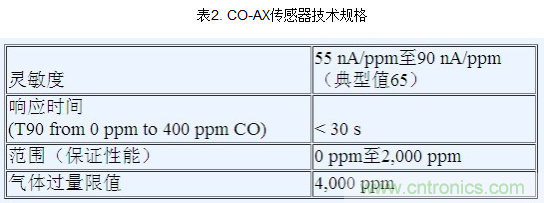 圖1所示為 Alphasense公司的CO-AX傳感器。表2是CO-AX傳感器技術規格摘要。