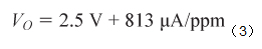 傳感器的最大響應為90 nA/ppm,如表2所示,其最大輸入范圍為2,000 ppm。因此,最大輸出電流為180 μA,最大輸出電壓由跨導電阻決定,如公式2所示。