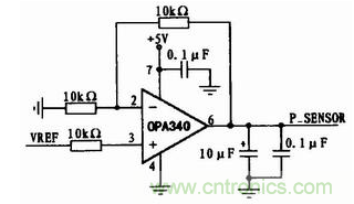 圖5中的輸入為圖4中的參考電壓(VREF)輸出。以低漂移、高穩定性運放OPA340組成的運放電路給傾角傳感器SCA100T提供電源,能保證電源紋波小,工作穩定。