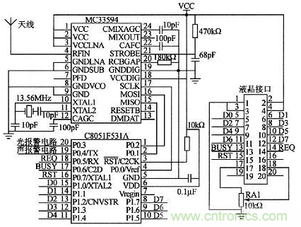 主控制器電路原理如圖3所示。主控制器模塊采用穩定、可靠的微控制器C8051F531A,其內置振蕩電路和增強型的SPI接口,外擴SPI無線接收芯片MC33594和操作簡單、方便的并行液晶模塊。