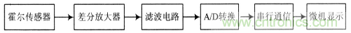 系統(tǒng)可以分為3個部分。第一部分是信號源,由霍爾傳感器產(chǎn)生電壓信號,信號通過差分放大,濾波得到較清晰的信號;第二部分是信號經(jīng)過A/D轉(zhuǎn)換送入單片機(jī)進(jìn)行處理,再通過串行通信送入PC機(jī)處理得到結(jié)果;第三部分是數(shù)據(jù)的顯示,這部分是通過VB的繪圖程序來完成,顯示結(jié)果以v-x關(guān)系圖來顯示。系統(tǒng)總流程如圖1所示。