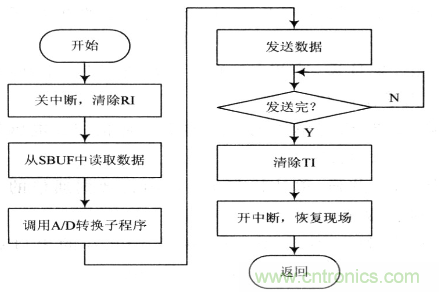 由于單片機(jī)多應(yīng)用于實(shí)時性較強(qiáng)的控制場合,為了盡量少占用CPU的時間,充分發(fā)揮CPU的功能。該系統(tǒng)在單片機(jī)程序設(shè)計(jì)中采用中斷方式與PC機(jī)進(jìn)行通信。主程序只進(jìn)行串行通信、數(shù)碼管實(shí)時顯示、模/數(shù)轉(zhuǎn)換結(jié)果的初始化和循環(huán)等待串行中斷工作,當(dāng)接收到PC機(jī)發(fā)來的信號時,就轉(zhuǎn)人中斷服務(wù)程序,進(jìn)行A/D轉(zhuǎn)換,并向Pc機(jī)發(fā)送數(shù)據(jù)。中斷服務(wù)子程序流程圖如圖6所示。