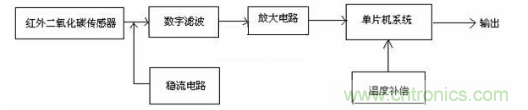 檢測(cè)電路由紅外二氧化碳傳感器、數(shù)字濾波電路、放大電路、穩(wěn)流電路、單片機(jī)系統(tǒng)、溫度補(bǔ)償?shù)冉M成。基本原理是紅外二氧化碳傳感器將檢測(cè)到的二氧化碳?xì)怏w濃度轉(zhuǎn)換成相應(yīng)的電信號(hào),輸出的電信號(hào)分別經(jīng)過(guò)濾波、放大處理,輸入到單片機(jī)系統(tǒng),并經(jīng)溫度和氣壓補(bǔ)償?shù)忍幚砗螅蓡纹瑱C(jī)系統(tǒng)輸出送顯示裝置顯示其測(cè)量值。