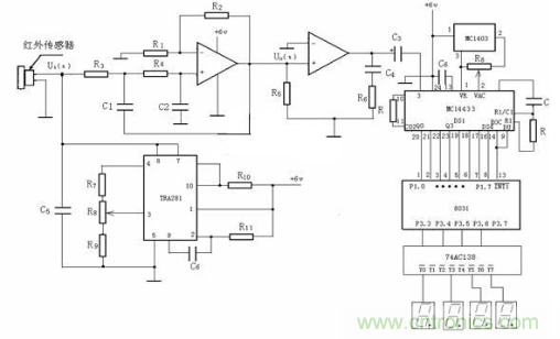 按照上述設(shè)計(jì)原理,設(shè)計(jì)的二氧化碳檢測(cè)電路如圖3所示。工作原理是首先由紅外傳感器將探測(cè)到二氧化碳?xì)怏w的濃度并轉(zhuǎn)換成電信號(hào),濾波電路提取電信號(hào)并輸出到放大電路,經(jīng)過(guò)單片機(jī)系統(tǒng)處理后輸出,再由74AC138送入顯示電路,以實(shí)現(xiàn)對(duì)二氧化碳?xì)怏w濃度的檢測(cè)。