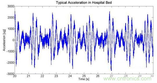 在最近的一項項目設計中,村田的工程師們分析了病人在病床上的活動,并分離出了心搏圖數據,心搏圖數據如圖3,從中可以看到床的諧振影響到信號,且隨時間衰減。而可靠的測量信號在10mg范圍,這需要加速度傳感器的分辨率特別的高,適合此應用的傳感器之一是村田的SCA61T,其噪聲密度大約是14μg/√Hz。