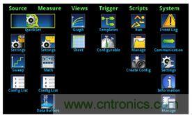 吉時利2450型交互式數字源表SMU儀器簡化了非傳統用戶的學習曲線,使之從使用多層菜單結構和多功能按鈕配置功能的繁瑣工作中解脫出來。2450型儀器使用基于圖標的平面菜單系統,就像在智能消費電子產品中使用的菜單系統一樣簡單,如平板電腦或智能手機上顯示的應用圖標排列。