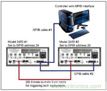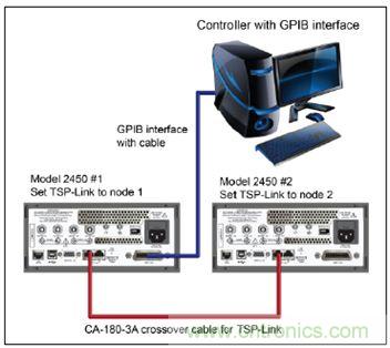 對于計算機與2450型儀器的GPIB通信,只需要1根電纜,實現GPIB接口與2450型儀器IEEE-488接口的連接(圖8中2450型#1)。將2450型#1的TSP-Link節點設為節點1,將2450型#2的TSP-Link節點設為節點2。