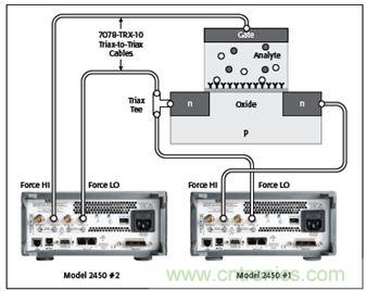 在這個例子中,使用4根三軸電纜(7078-TRX-10型),實現2450型儀器后面板母三軸插孔與BioFET器件的互連,它被安裝在一個金屬屏蔽的測試夾具內,與母三軸插孔連接。利用三軸三通(237-TRX-T型)實現兩部2450型儀器的Force LO端與BioFET源端連接。
