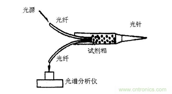 用來測定活體組織和血液值pH光纖光譜傳感器示意圖,如圖5所示。其工作原理是利用發射光、透射光的強度隨波長的分布光譜來進行測量。這種傳感器將兩根光纖插入可透過離子的纖維素膜盒中.膜盒內裝有試劑,當把針頭插入組織或血管后,體液滲入試劑,導致試劑吸收某種波長的光。用光譜分析儀測出此種變化,即可求得血液或組織的pH值。