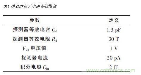 之所以稱為固定模式噪聲,是因為這種噪聲產生的影響不隨時間的變化而變化,即表現在每幀圖像上的誤差是一致的。像素的固定模式噪聲可以通過讀出電路中的相關雙采樣電路進行消除。通過以上分析,在本電路中,噪聲的主要來源在于光探測器的散粒噪聲和CTIA 放大器的閃爍噪聲, 輸出總噪聲為