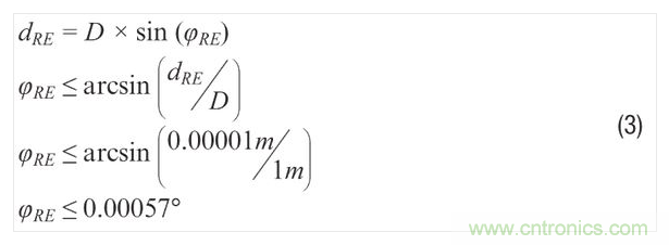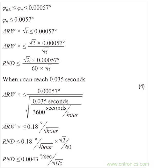 回過(guò)頭看圖2中的應(yīng)用示例,將公式1和公式2結(jié)合便可把重要標(biāo)準(zhǔn)(檢查表面上的物理失真)與MEMS陀螺儀數(shù)據(jù)手冊(cè)通常會(huì)提供的噪聲性能指標(biāo)(RND、ARW)關(guān)聯(lián)起來(lái)。在此過(guò)程中,假設(shè)公式1中的積分時(shí)間 (τ) 等于圖像捕捉時(shí)間可提供進(jìn)一步且很有用的簡(jiǎn)化。公式3利用公式1中的一般關(guān)系來(lái)估 計(jì),當(dāng)攝像頭距檢查表面1米 (D) 且最大容許失真誤差為10μm (dRE) 時(shí),陀螺儀的角向誤差 (φRE) 必須小于0.00057°。