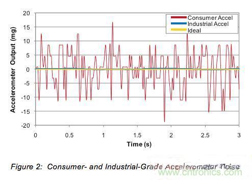 ● 加速度計對運動太過敏感,極易導致手的抖動。在短時間內這是非常令人惱火的,因為它意味著光標或屏幕渲染的目標也會抖動。幾分鐘以上的抖動將導致顯著的累積方向或位置誤差,特別是當加速度計的噪聲與抖動在相同數量級時。目前廣泛使用的低成本消費級加速度計的噪聲要比價格更高、體積更大、功耗更高的工業級加速度計大得多,如圖2所示。