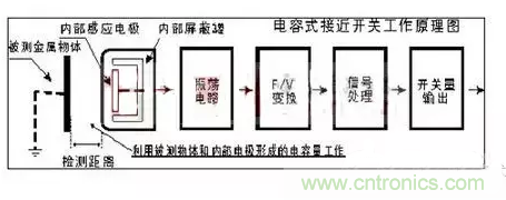 電容式接近傳感器的工作原理:電容式接近傳感器由高頻振蕩器和放大器等組成,由傳感器的檢測面與大地間構成一個電容器,參與振蕩回路工作,起始處于振蕩狀態。當物體接近傳感器檢測面時,回路的電容量發生變化,使高頻振蕩器振蕩。振蕩與停振這二種狀態轉換為電信號經放大器轉化成二進制的開關信號。