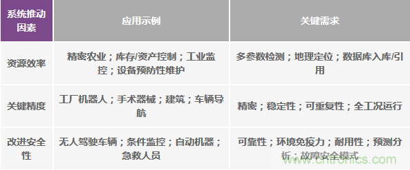 工業機械和流程最具價值的進步集中在有形的系統級優勢上,而這通常會帶來設計和實現方面的挑戰,這些挑戰又會發展成新的問題解決方案和業務模式。這種系統級推動因素可以歸納為三項追求,即對資源效率、關鍵精度和更高安全性的追求。瞄準這些橫跨多個行業的改進的應用,包括跨越空中/地面/海上、室內/室外、短期/長期和人/機等,但無論如何,它們都依賴于共同的屬性;即精度、可靠性、安全性和智能處理與分析,如表1所示。