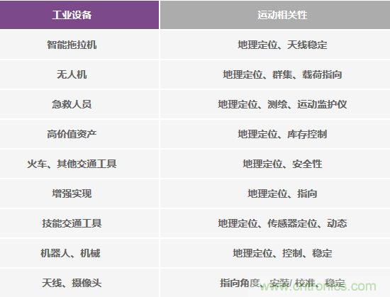 多數情況下,物聯網都處于運動狀態。即使不處于運動狀態——比如,靜止的工業安全攝像頭——精密指向仍可能必不可少,或者,關于無用運動(篡改)的知識也可能非常有價值。如果能在惡劣的飛行條件下維持精確的指向角度,用光學載荷捕捉作物圖像的無人機就有可能更快地帶來更好的結果;如果能為光學數據提供準確的地理測繪信息,則有可能實現對數據和趨勢的歷史比較。智能交通工具,無論是地面交通工具,還是空中或海上交通工具,它們都越來越依賴GPS導航。然而,GPS遭受的精度壓力也越來越大,無論是有意為之,還是自然使然(建筑物、樹木、隧道等)。如果選擇時考慮了精度需求,則額外的傳感器仍然可以在事故中斷期間可靠地進行航向角推算。表2列出了使IoMT(運動物聯網)中的M(運動)概念名符其實的一些因素,注意運動與通用應用之間的關系。