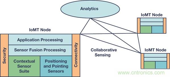 運動物聯網節點輸出的有效性和價值最為依賴的是核心傳感器的質量以及它們高保真地捕捉應用情境的能力。因此,融合處理是傳感器校正/增強的必然選擇,也是理想捕捉傳感器間狀態動態的必備條件(例如,在任意給定時間點,哪個傳感器最可靠)。應用級的處理以分層方式融入解決方案之中,并根據環境特點進行優化,包括適當的邊界條件。雖然這種方式是自動的,但在有些情況下,這些節點會協同工作,比如在地面或空中成群的無人駕駛交通工具中。在這些情況下會部署安全鏈路,強調可靠傳輸和受保護的特有身份信息,如圖2所示。
