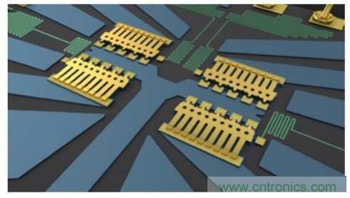 圖三中所示為四組在單刀四擲(SP4T)乘法器組態設定下的MEMS開關。 每組開關梁具有五組并聯的奧姆接點,用以在開關關閉時降低電阻與提高電力的處理。