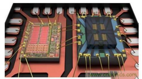 圖四 : 驅動IC(左側),MEMS開關芯片(右側)被黏著和線焊至金屬導線架上