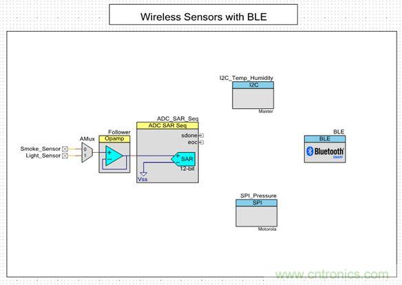 內置BLE功能的處理器的靈活性和豐富資源,使傳感器能夠與單一BLE設備連接。圖2是使用PSoC Creator的典型配置。PSoC Creator是一個用于圍繞PSoC架構開發應用程序的IDE。圖中顯示的是模擬和數字傳感器接口以及BLE子系統。該配置展示的是用于感測煙霧、光照強度、溫度、濕度和壓力的典型工業數據監測系統。配置中的每個組件都有一個關聯的應用程序編程接口(API),開發人員可根據需要訪問這些組件。每個組件還有一個與其相關的數據表對組件的可用配置進行說明。