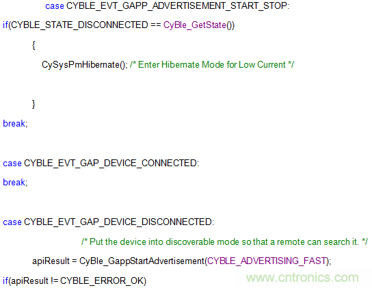 BLE中的一切都作為“活動”處理。BLE堆棧提供處理這些事件的“定義”。以下代碼片段展示了其中一部分活動的運行。