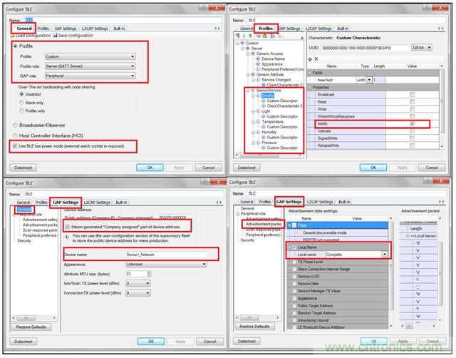 BLE組件在其GAP層中被配置為從設備。這使任何BLE設備(如BLE手機)都可以掃描此設備,在BLE從設備包含其名稱廣播時被BLE手機連接。此外,在其GATT層中,BLE設備被配置為具有自定義配置文件的GATT服務器。下面將討論BLE低功耗特性在該組件內啟用。名為“Sensor Service”的單一服務具有5種不同的特性,用于采集每個傳感器的數據。每個特性都具有通知功能,可以將傳感器數據作為通知發送。
