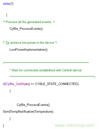 一旦兩個設備實現連接,就能使用連接間隔不同的通知發送數據。應用程序接口“CyBle_ProcessEvents()”應置于while(1)循環中,且必須在每個連接間隔中至少調用一次。我們也可以調用在同一while循環中將數據作為通知發送的函數。以下函數可用于將溫度數據的一個字節作為通知發送。這也適用于其他傳感器特性。