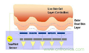 工作原理則不一樣;其是利用手指按在芯片表面時,指紋的波峰波谷對芯片內部電容上下電極電荷分配的比例影響程度來對指紋進行重現指紋,無需額外增加驅動源,芯片結構非常單純(如下圖),也因為無額外驅動信號,所以模組也無需外置Ring,模組結構也非常簡單。