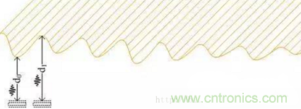 其原理是將電容感整合于一塊芯片中,當指紋按壓芯片表面時,內部電容感測器會根據指紋波峰與波谷而產生的電荷差,從而形成指紋影像。如下簡圖,可以把上面的凹凸認為是指紋的谷和脊,那么同傳感器就會形成不同的電容差,這樣傳感器就可以根據這些不同的電容差畫出指紋的紋理。
