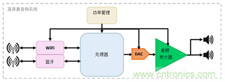 處理器執(zhí)行各種音頻處理功能,如解碼和信號均衡,同時也處理Wi-Fi和/或藍牙通信軟件堆棧。過去,CD品質的采樣頻率可能已足夠。但是今天的高保真音頻系統對信號鏈中的處理器提出了其它要求,因為高保真音質要求在24位音樂信號流中提供48kHz至192kHz范圍內的采樣率。