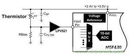 從技術上講,熱敏電阻是一種電阻器,它的電阻值隨溫度的變化而變化。如圖1中所示,需要一個偏置電路和少數幾個外部組件,在這里,偏置電阻器和熱敏電阻組成了一個分壓器,并且被接到一個可選運算放大器上,這個運算放大器與微控制器 (MCU) 的模數轉換器 (ADC) 相連,從而將熱敏電阻的電阻值轉換為一個溫度值。