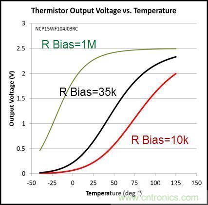 熱敏電阻的缺點是,只有在很窄的溫度范圍內,它的輸出才是線性和準確的,而在這個范圍之外會變得非線性。圖2繪制了三條熱敏電阻的輸出曲線,偏置電阻分別為1MΩ、35kΩ和10kΩ。在窄溫度范圍內,每條曲線都是線性的,不過在偏置電阻分別為1MΩ、35kΩ和10kΩ,而溫度分別為10ºC、75ºC和50ºC以下時,這三條曲線為非線性。雖然針對特定溫度,可以使用專門校準的熱敏電阻來實現目標精度,但是這種熱敏電阻成本較高,并且這三款不同的器件也使得庫存管理變得過于復雜。其它缺點還包括無法預計的故障、抗擾度低和功耗較高。