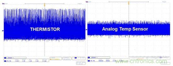 圖6:熱敏電阻與模擬溫度傳感器在連接到開關穩壓器時的噪聲實驗