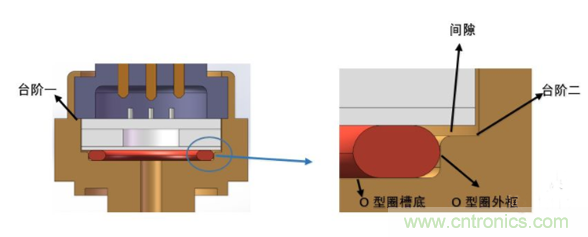 通過控制上圖中臺階一與O型圈槽底的高度差,對O型圈壓縮量進行控制。