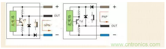 PNP型當傳感器有檢測信號VT導通,正極的電流流向輸出端OUT,輸出端OUT電位接近正極,通常說的低電平翻轉成高電平。