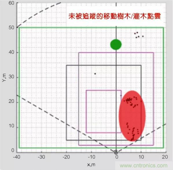 圖2顯示了使用毫米波技術的入侵探測;毫米波傳感器分析場景中物件的速度,過濾出移動背景中的運動,僅追蹤人物。