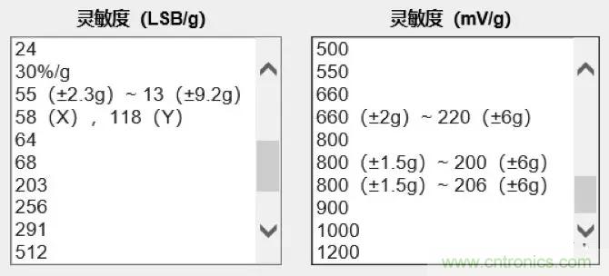 靈敏度(LSB/g)主要針對數(shù)字輸出加速度傳感器,代表一個重力加速度(g)下,輸出能區(qū)分多少位LSB。上面已經(jīng)根據(jù)應(yīng)用要求推導(dǎo)出,假設(shè)應(yīng)用要求最小分辨率為1°,靈敏度需要大于58LSB/g。那么可以根據(jù)這一結(jié)果直接在參數(shù)欄里選擇。