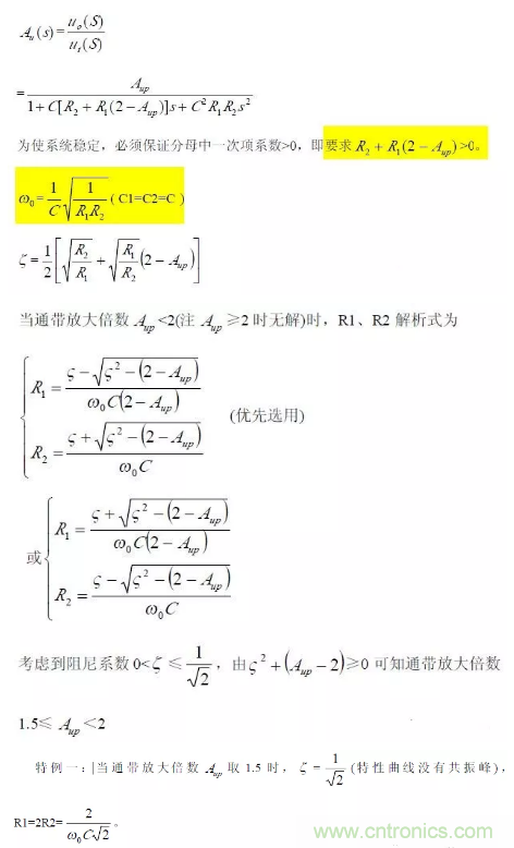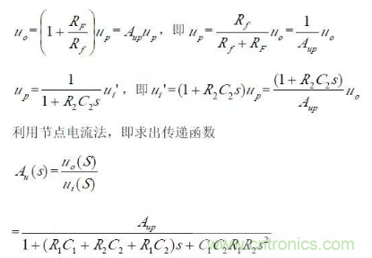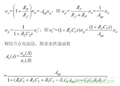 對于二階壓控低通濾波器來說,當通帶放大倍數Aup =1(單位增益)時,圖所示電路變為圖所示,其中RF=R1+R2。